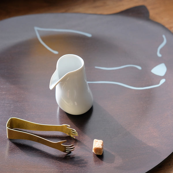 Grand plateau en bois avec un motif chat, tenu par une personne portant des gants